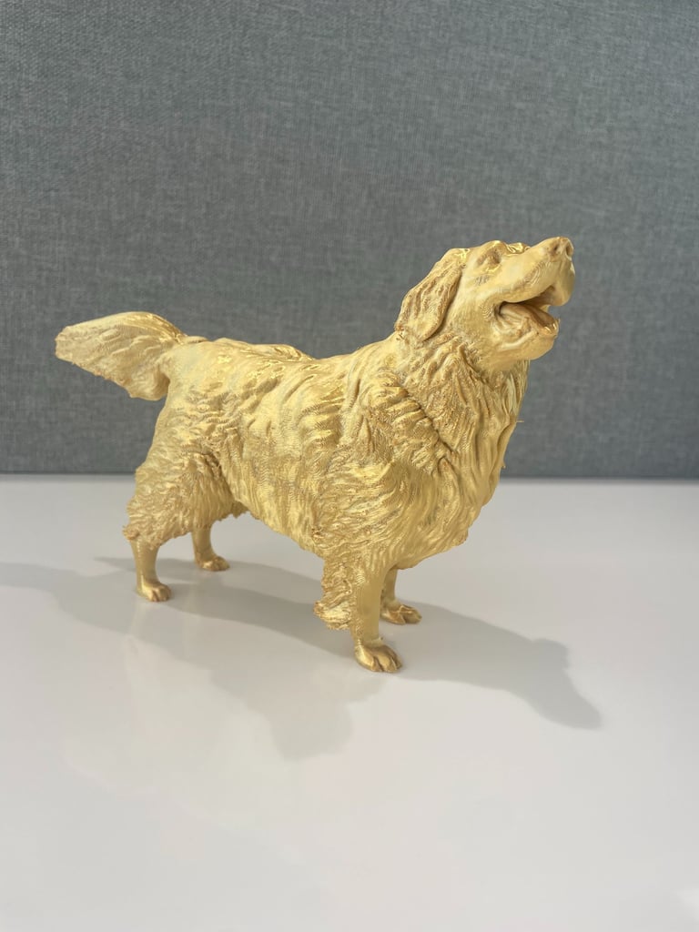 Our 3D prints tell your stories — like a beloved dog’s statue with life dates, honoring the bond that never fades.